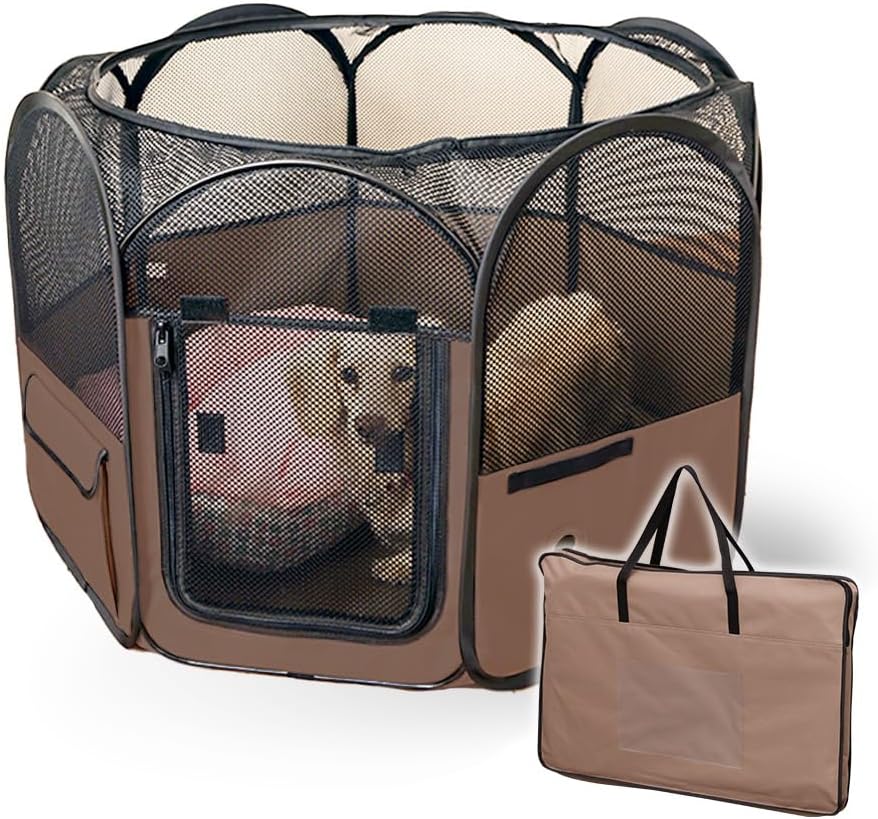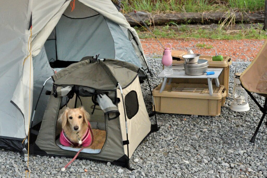 キャンプに慣れていない犬の場合は、テント内にサークルを置いてあげると、安心して寝てくれやすいです。メッシュ素材のサークルなど、簡単に折りたためるものが便利ですが、メッシュを噛みちぎって脱走することがあるので注意しましょう。