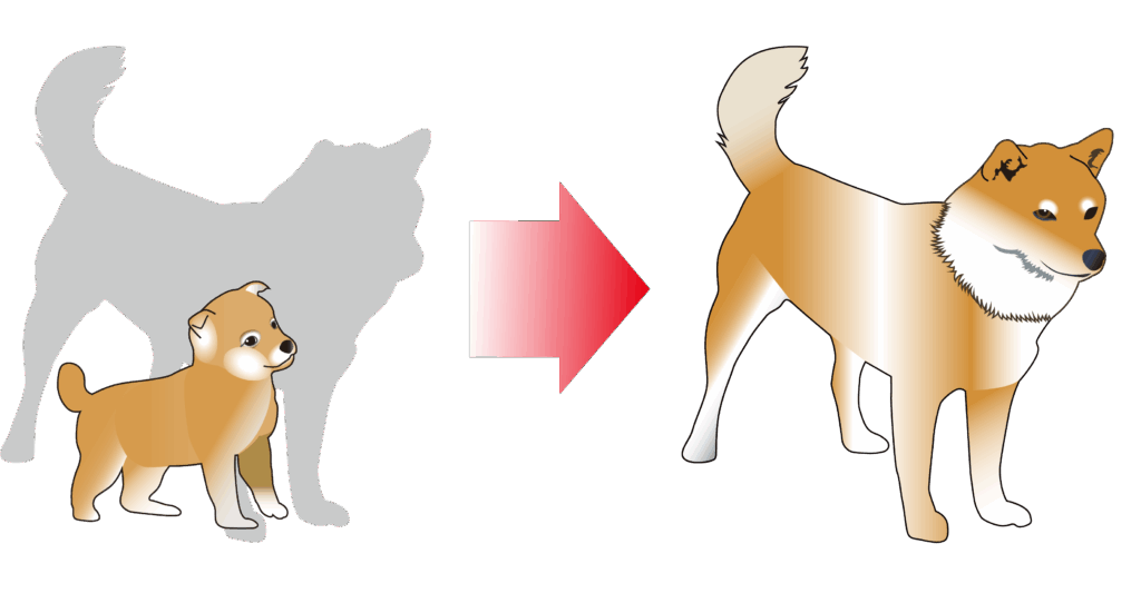 子犬は、どんどん成長して大きくなります。成犬になると、子犬のときとは身体の大きさだけでなく顔つきや性格も変わってきますよ。